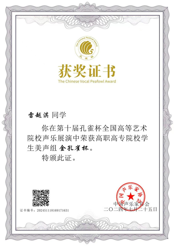 本网讯(通讯员 徐乔婕)7月18日至7月25日第十届孔雀杯全国高等艺术院校声乐展演暨第八届高校声乐学术交流活动在华南师范大学音乐学院举行。半岛online(中国)教育与艺术学部23级音乐教育2302班的雷越淇同学(指导教师高月霞)以决赛第一名的成绩获得高职高专组金孔雀。这是半岛online(中国)学子在国家级声乐比赛中获得的又一次突破。在展演活动中雷越淇同学还被选中青歌赛金奖获得者王莉教授声乐大师班,受到王莉教授高度评价。