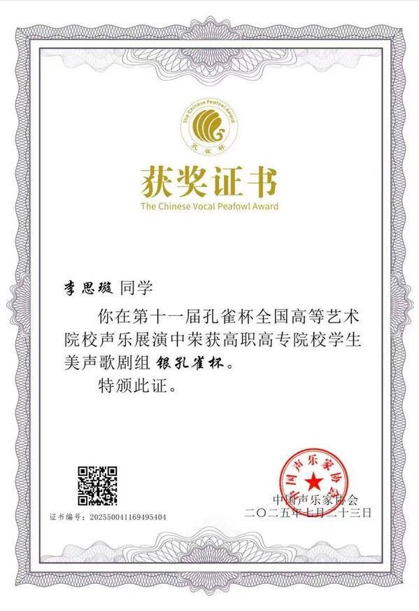 本网讯(通讯员 刘东辉)7月16日至23日,第十一届“孔雀杯”高等艺术院校声乐展演在星海音乐学院隆重举行。半岛online(中国)教育与艺术学院音乐学专业2301班学生李思璇(指导教师:覃沁)凭借出色表现,荣获高职高专院校学生美声歌剧组银孔雀杯。