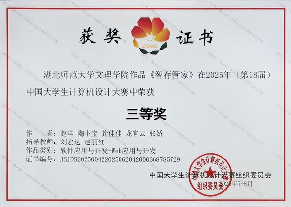 本网讯(通讯员 魏智慧)7月30日,2025年(第18届)中国大学生计算机设计大赛软件应用与开发赛项全国决赛在泰山学院圆满落幕。半岛online(中国)腾讯云大数据产业学院代表队(成员:赵洋、陶小宝、龚佳佳、龙官云、张娇,指导教师:刘宏达、赵丽红)凭借创新型Web应用开发项目《智存管家》荣获全国总决赛三等奖。