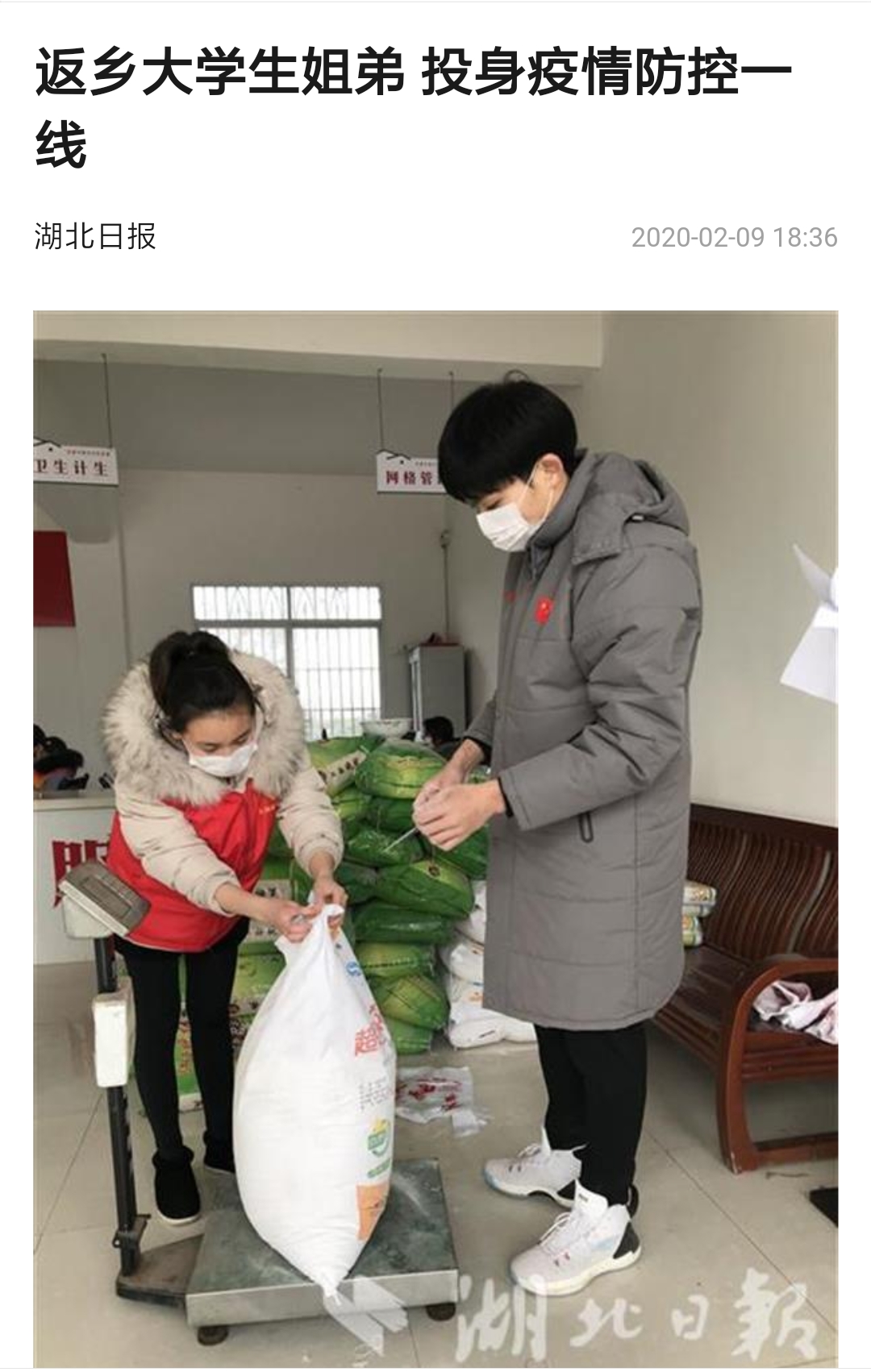 2020年2月9日,湖北日报上有一篇关于疫情防控的新闻引起广泛关注,主人翁正是半岛网页版登入界面理工学部数学与应用数学专业1603班的吕奎同学和其弟弟吕东阳。据报道,2020年2月7日,姐弟俩从村微信群里看到“志愿者征集令”后,2月8日一大早便到三州村委会报到,参与对村民生活必需品的分装与发放。图片中是2月8日当天,他们在枝江市百里洲镇三洲村防疫物资分配现场填写订购物资的订购居民的姓名并给居民分配物资时的情景。姐弟俩一个牵着口袋,一个则对袋中面粉进行分装。分装完面粉后,又开始为居家隔离的村民分装集中采购的大米、面条和新鲜的蔬菜并贴上标签,以备村组干部精准送达村民家中。