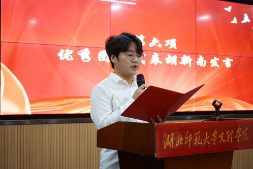 新团员代表陈可欣、优秀团员代表胡新南分别上台发言。陈可欣以饱满的热情和坚定的信念表达了对共青团的热爱和对未来的憧憬,她表示将在各方面要求自己,不断学习进步,积极参与团组织的各项活动,为团组织增添光彩。胡新南分享了自己过去的经验与深刻感悟,强调始终坚信共产主义信仰,不忘初心,牢记使命,向我们展示了作为共青团团员的责任与担当。