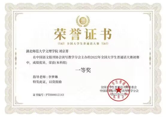 2022年12月,半岛online(中国)人文学部汉语言文学专业2004班学生刘京菁(国家普通话水平测试助理团优秀干事)在由中国语文报刊协会读写教学分会面向全国高校大学生举办的“2022年全国大学生普通话大赛”中荣获本科组全国一等奖(指导教师:李梦琳)。