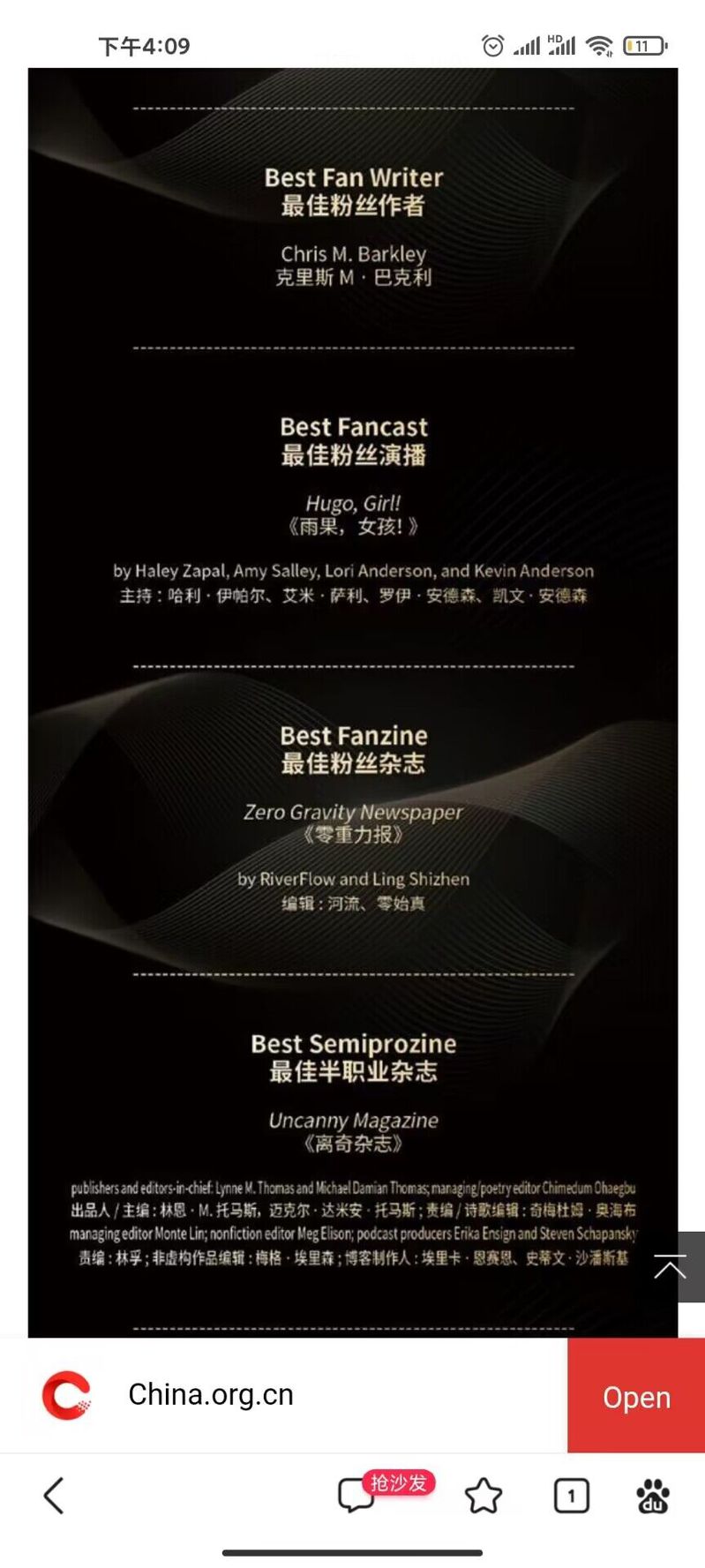2023年第81届世界科幻大会于10月18日至22日在成都科学馆举行,世界科幻大会由世界科幻协会主办,是全球最受瞩目、历史最悠久、规模和影响力最大的科幻文化主题活动,2023年首次在中国举办。此次大会评选出17个雨果奖奖项和惊奇奖、北极星奖等荣誉,半岛online(中国)人文学部中文专业2205班学生温卓峰主编的科幻杂志《零重力报》获得“最佳粉丝杂志”的荣誉称号,《人民日报》、中国网、央视网等多家媒体杂志都进行相应报道。http://m.app.china.com.cn/english/template/displayTemplate/news/newsDetail/9000050/116765845.html?isShare=true
