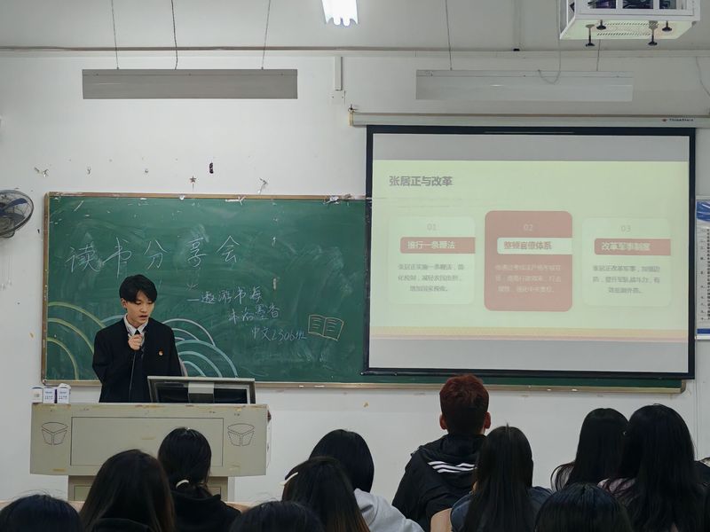 活动伊始,主持人方洪基同学简明而富有感染力地阐述了本次分享会的深远意义。读书,既是获取知识的途径,也是塑造品格、激发创造力、丰富人生的重要方式。通过此次分享同学们不仅能够在书籍的陪伴下互相交流思想,还能够在思想的碰撞中升华自我,拓宽人生的广度与深度。接下来,熊丹丹、甘齐、刘茂、郭妍欣、李诗宇五位讲书人相继登场,他们选择的书籍横跨古今中外,内容丰富,分别给大家带来了《平凡的世界》、《百万英镑》、《万历十五年》、《红楼梦》、《苏东坡传》等经典著作。五位分享同学从不同的角度和层次,生动呈现了书中的人物风貌与思想内涵,并与现场同学分享了各自的阅读心得与感悟。每一位讲书人都用心准备,精彩的讲解引发了现场观众的热烈反响,激发了同学们对于文学与历史的深刻思考。