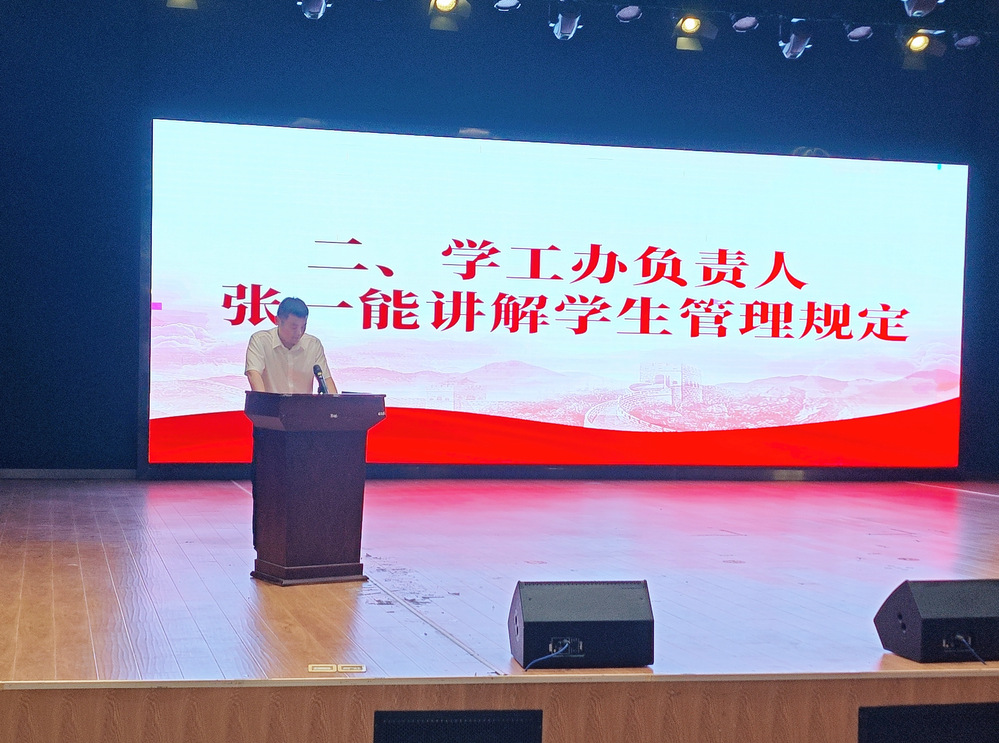 学工办负责人张一能老师为学生详细解读了学生管理规定。他强调“规则是自由的边界,更是安全的保障”。英语教研室主任邓薇薇老师作为教师代表,围绕“如何在人工智能的时代下发展我们的英语优势?”话题展开,为同学们明晰前进方向。
